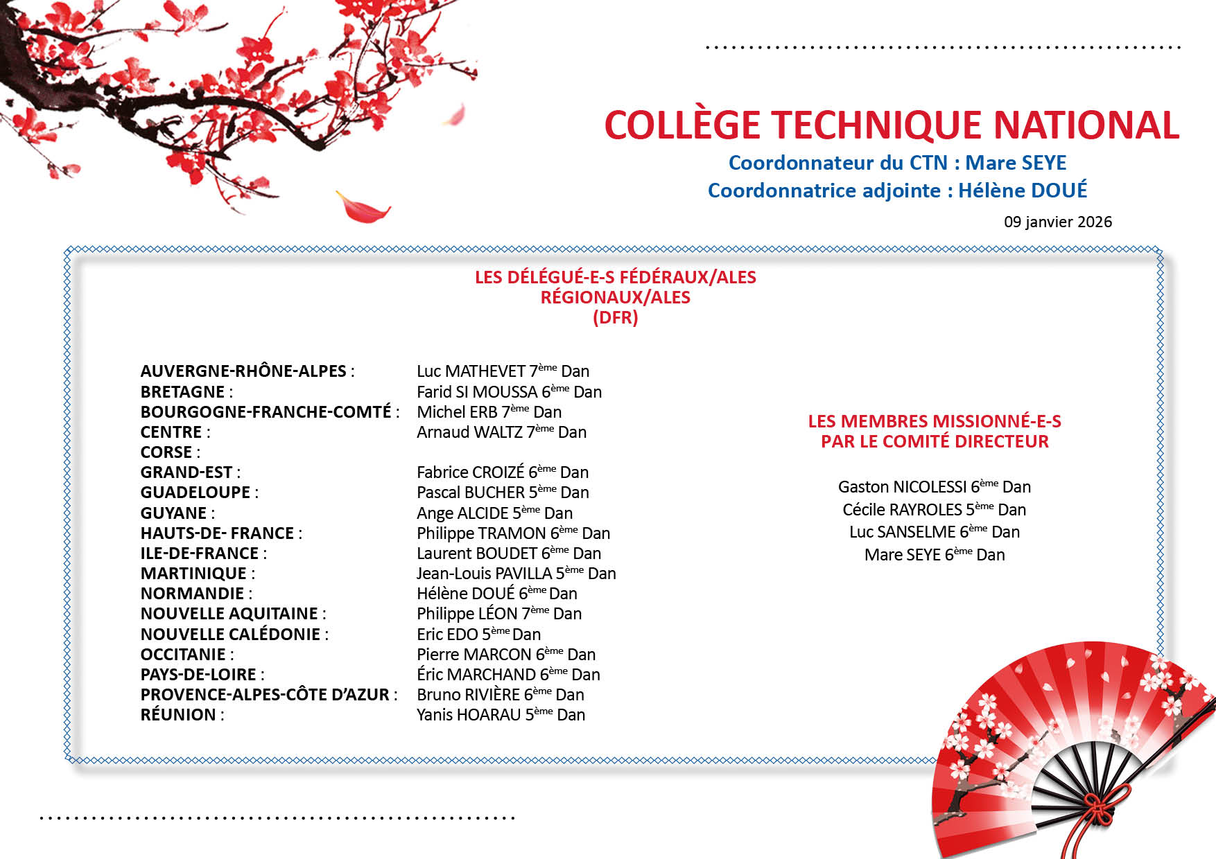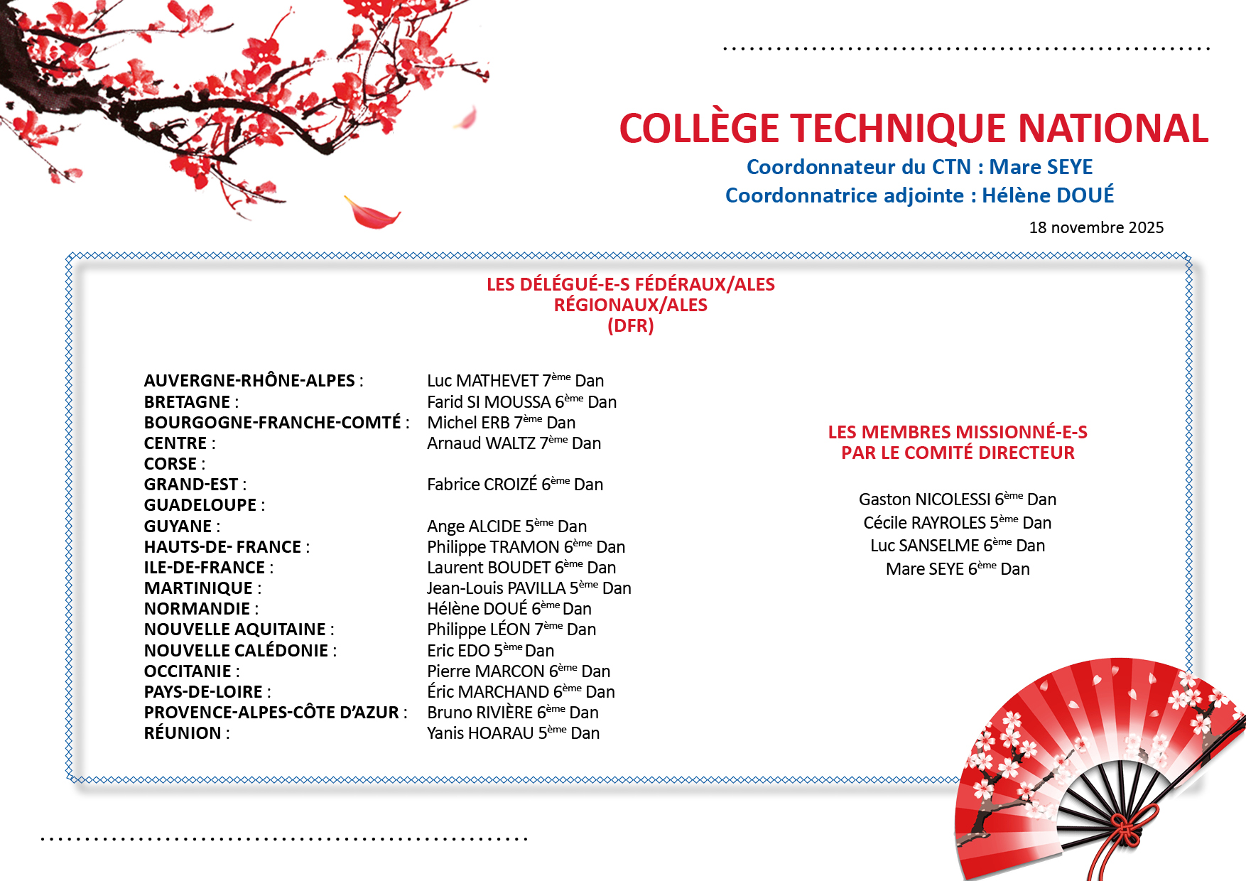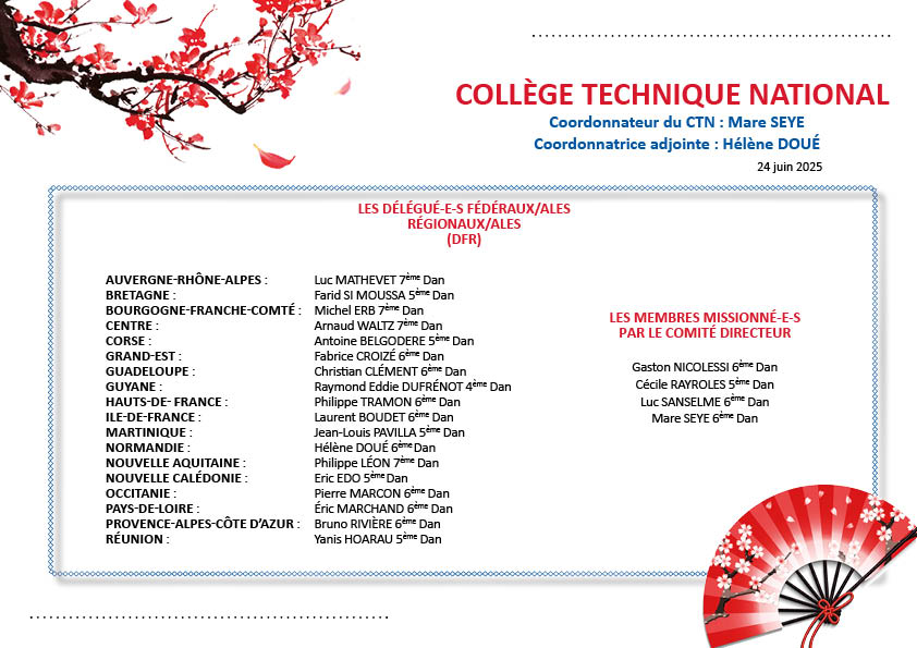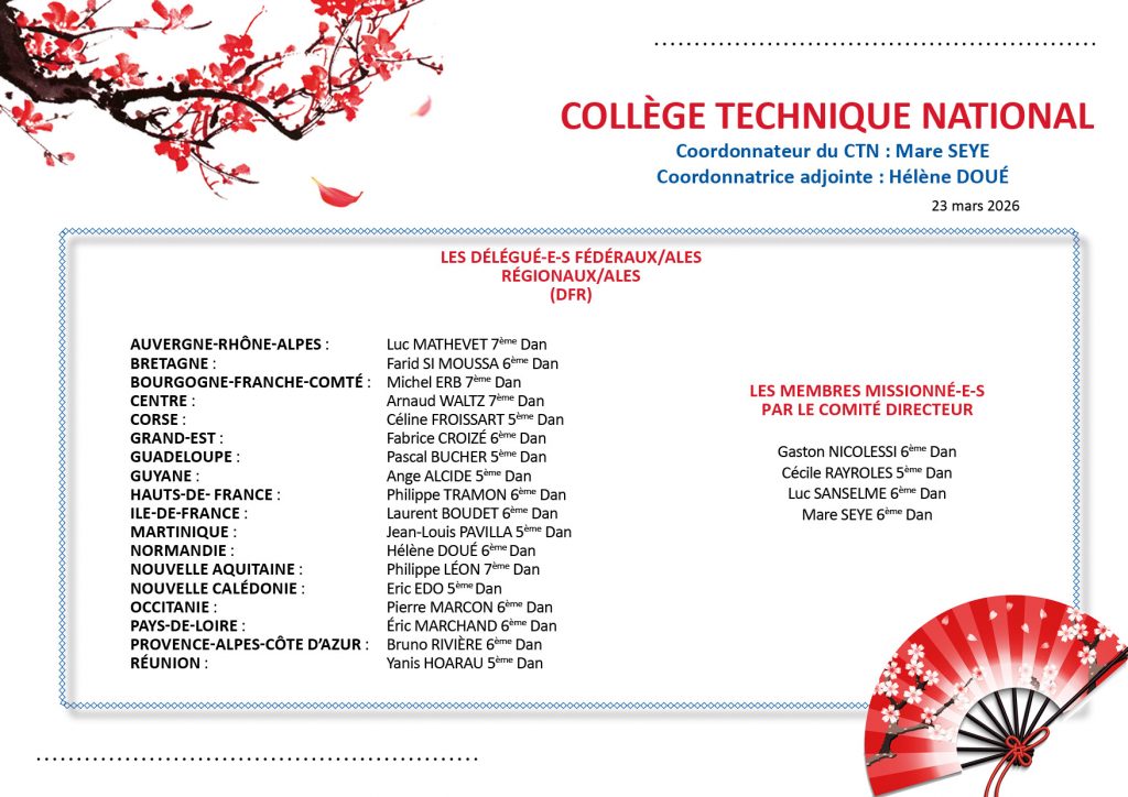 Ces membres participent également aux jurys des examens de grades DAN et d’enseignement (Brevet fédéral, CQP MAM, DEJEPS et DESJEPS).