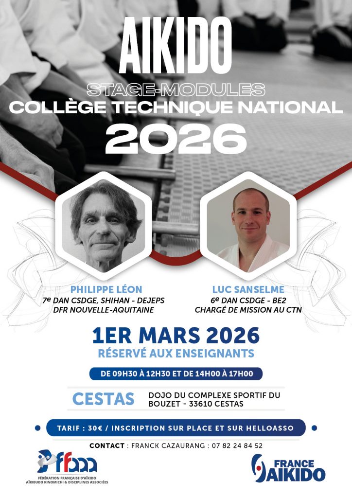 Dans le prolongement des stages-modules du Collège Technique National, un nouveau rendez-vous est proposé en Nouvelle-Aquitaine le dimanche 1er mars 2026 à Cestas, sous la conduite de Luc Sanselme et Philippe Léon Shihan.